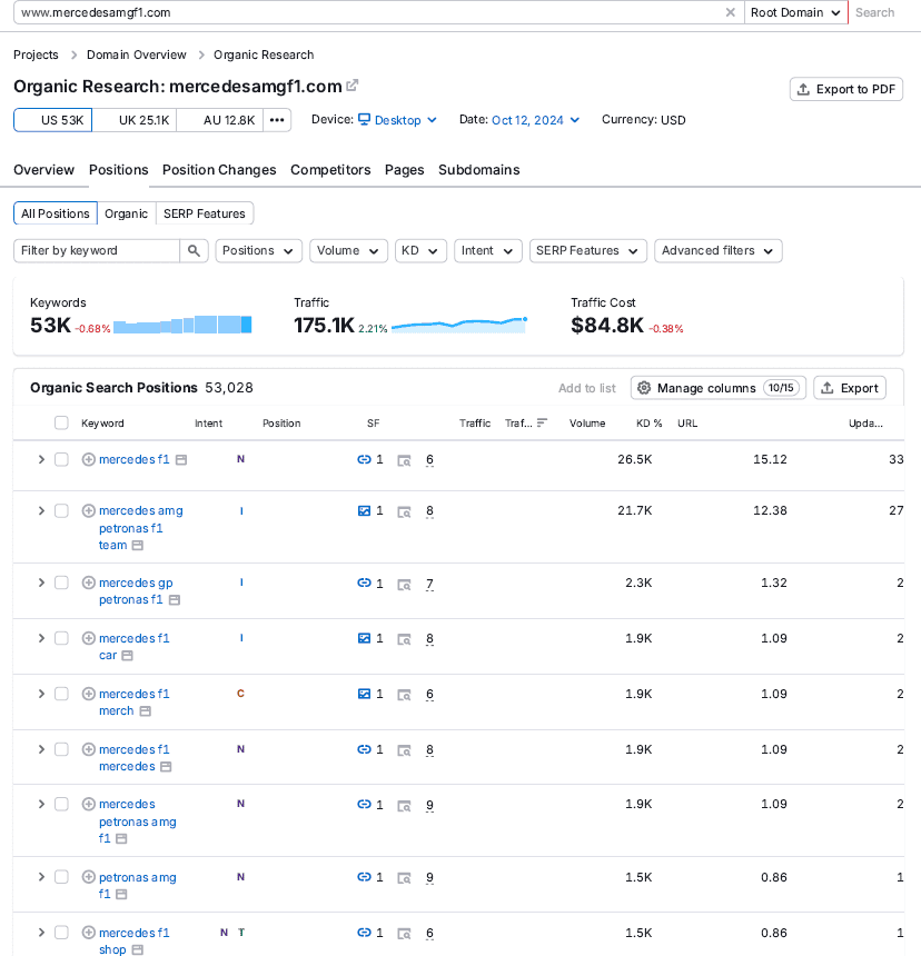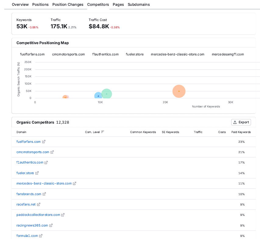 To uncover the most effective SEO keywords and maximize conversion funnels on the busiest pages of leading motorsport websites, and we identified Mercedes AMG F1 strategically performed better. We conducted a competitor analysis using SEMrush to gain insights. This targeted approach helps us stay competitive and drive significant traffic to our platforms.